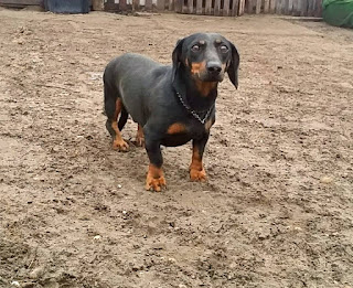 Megérkezett a gondozásunkba Manfréd, a 3 év körüli standard fekete-cser tacskó kan.